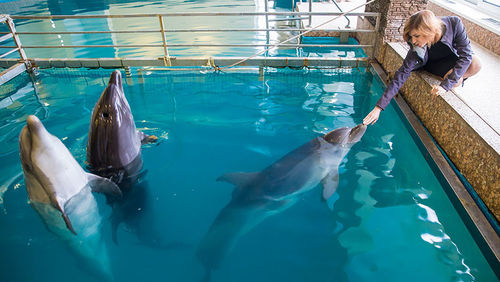 当地时间2016年3月15日,克里米亚辛菲罗波尔,克里米亚美女检察长娜塔莉亚·波克隆斯卡娅在水族馆中与海豚玩耍。