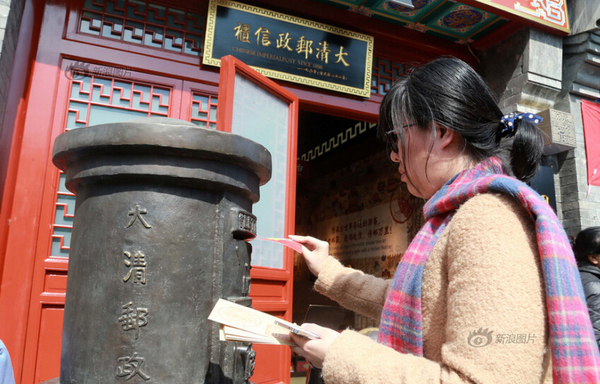 2016年03月20日,北京,因装修停业一个多月的大清邮政信柜在什刹海烟袋斜街重张开业。重张后的信柜除保留原有邮政业务外,还新增邮驿博物馆,为游客呈现从商周时期到清代的邮驿发展历程。游客在大清邮政信柜门前投寄明信片。