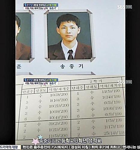 宋仲基因为当兵离开演艺圈两年,接拍《太阳的后裔》后,人气瞬间回升,更凭着该剧掳获大批少女的心,而他大学时期就读的成均馆大学,是韩国当地数一数二的一流学校,高材生的名号为众人所皆知,近日在SBS节目《早安》当中,也公开了他就读大田高中时期的成绩单。