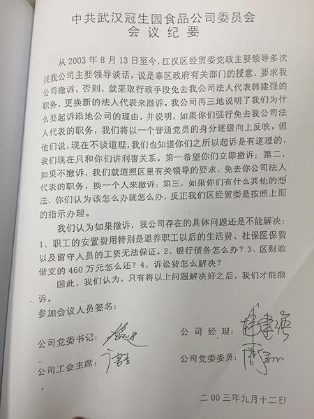 冠生园党委关于撤诉的内部会议纪要