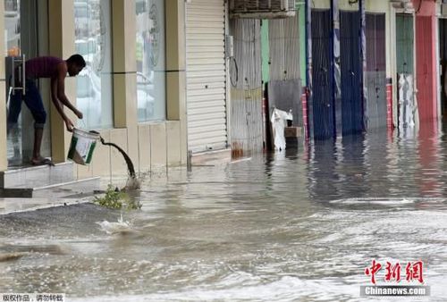 当地民众用水桶将屋内的积水舀出。