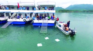 主办方在千岛湖上展示“冰书蕴湖”创意公益项目。
