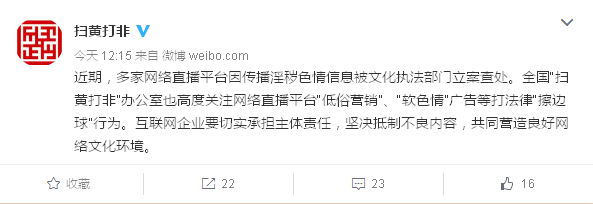 【新民网讯】据全国“扫黄打非”办公室官方微博消息,近期,多家网络直播平台因传播淫秽色情信息被文化执法部门立案查处。全国“扫黄打非”办公室也高度关注网络直播平台“低俗营销”、“软色情”广告等打法律 “擦边球”行为。互联网企业要切实承担主体责任,坚决抵制不良内容,共同营造良好网络文化环境。