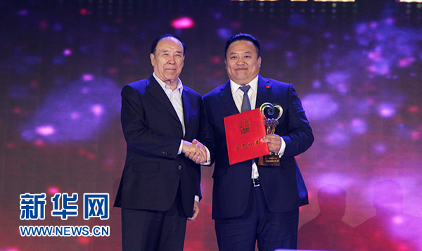 中国慈善榜发布会现场,第十届全国人大常委会副委员长司马义·艾买提为“最具变革精神公益领袖”获得者钢子颁发奖杯和证书。