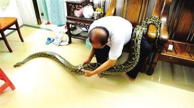 原标题:海口老人7年前收养蟒蛇当宠物 一家人与蛇和谐共处