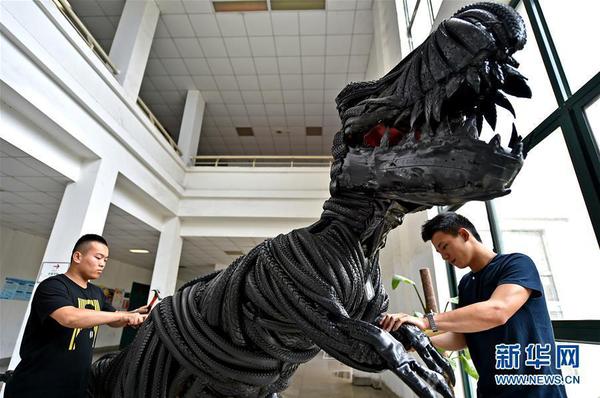 5月28日,河南洛阳师范学院大学生在对“轮胎恐龙”进行修整。河南洛阳师范学院5名大学生利用回收的约600个废弃自行车轮胎,耗时一个半月制作完成了一只高2.3米、长4米的恐龙模型。据团队成员刘子禅介绍,这只“轮胎恐龙”先用螺纹钢焊接出骨架,之后根据恐龙关节及肌肉的实际需要,将自行车车胎裁剪、扯平,包裹整个骨架。新华社发 黄政伟 摄 图片来源:新华网