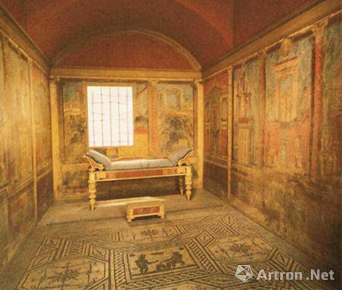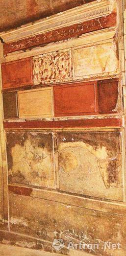 除此,庞贝古城的装饰者常利用彩色灰泥浮雕模仿大理石板的效果,这种墙面装饰的方法至今仍被运用在一些私人图书馆或公司会客室里,即运用便宜的建造材料模仿实木的视觉与触觉效果。