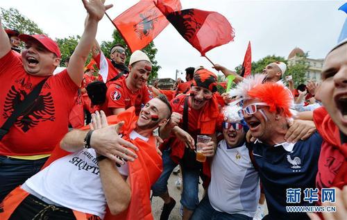 6月15日,阿尔巴尼亚球迷(左)与法国球迷(右)一起在场外狂欢。当日,在法国马赛进行的2016年欧洲足球锦标赛小组赛A组比赛中,法国队对阵阿尔巴尼亚队。新华社记者 陶希夷 摄 图片来源:新华网