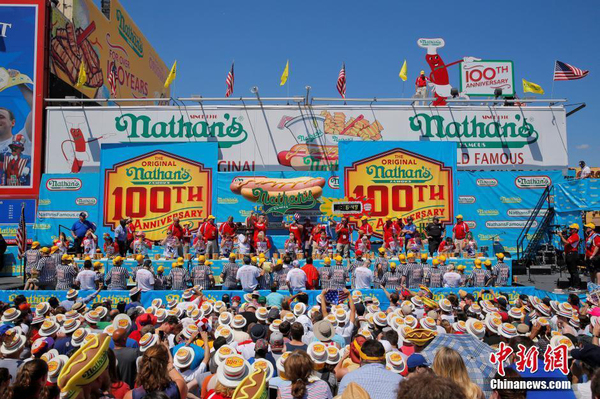 当地时间2016年7月4日,美国纽约,当地举办吃热狗大赛,庆祝独立日。