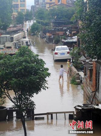 7月9日13时45分,今年第1号台风“尼伯特”以强热带风暴级在福建石狮沿海登陆,中心最大风力10级(25米/秒)。受其影响,福建中部沿海地区发生暴雨到大暴雨,局部特大暴雨,造成莆田、闽清、永泰等多地内涝严重。图为受淹的莆田市区内,小朋友在家门口戏水。 中新社记者 吕明 摄