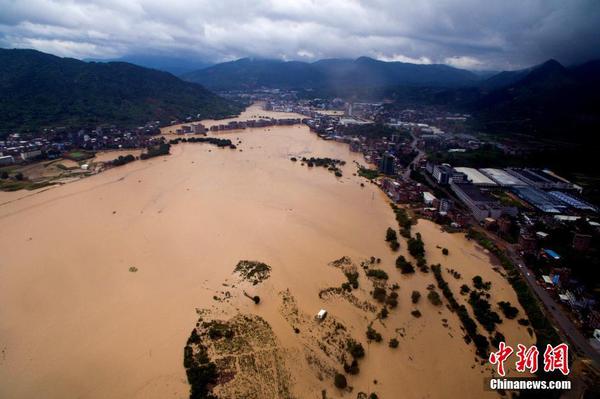 7月9日13时45分,今年第1号台风“尼伯特”在福建石狮沿海登陆。受台风影响,强降雨侵袭福建省闽侯县鸿尾乡,导致该乡穆源溪山洪暴发,冲毁堤坝,下游多个村庄被淹。图为航拍山洪灾害。