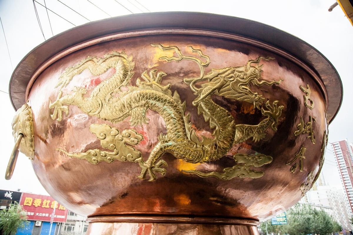 据介绍,这个火锅是按照真实火锅的尺寸等比例放大制作的,高5.55米,直径5.35米,总重量3.3吨,耗时两个多月量身订制,通体铜质,花费40余万人民币。