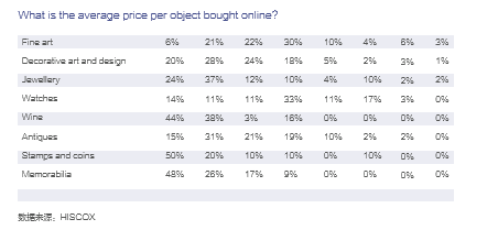 艺术品电商、在线拍卖等交易规模扩大。据 Hiscox 2016 年线上交易报告统计,2015 年 全球在线交易规模为32.7亿美元,增幅为23.86%,以此增长速度发展,Hiscox预计2020 年交易额达 95.8 亿美元。线上交易门类涵括邮品钱币、纪念品、艺术衍生品、酒类、珠宝、 手表、纯艺术(绘画、版画、摄影为主)、古董、装饰和设计艺术等,绝大多数交易价格在 1 万英镑以下,其中邮品钱币、纪念品和酒类价格集中在 500 美元以下。