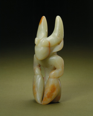黄绿色玉料,身上有大面积铁褐色沁斑。人像蛋形首,尖下颏,面部窄而前凸,眼睛及嘴部均以阴刻线刻画。全身赤裸,唯头上戴一动物头形的冠帽,动物眼睛圆凸,有两个竖直的长角,双耳镂空。冠帽前缘、人首额头处有浅刻的网格纹。人像细腰长腿,呈坐姿,上肢弯曲抚于腿上。后颈部有大的对穿孔,可以悬挂佩带。