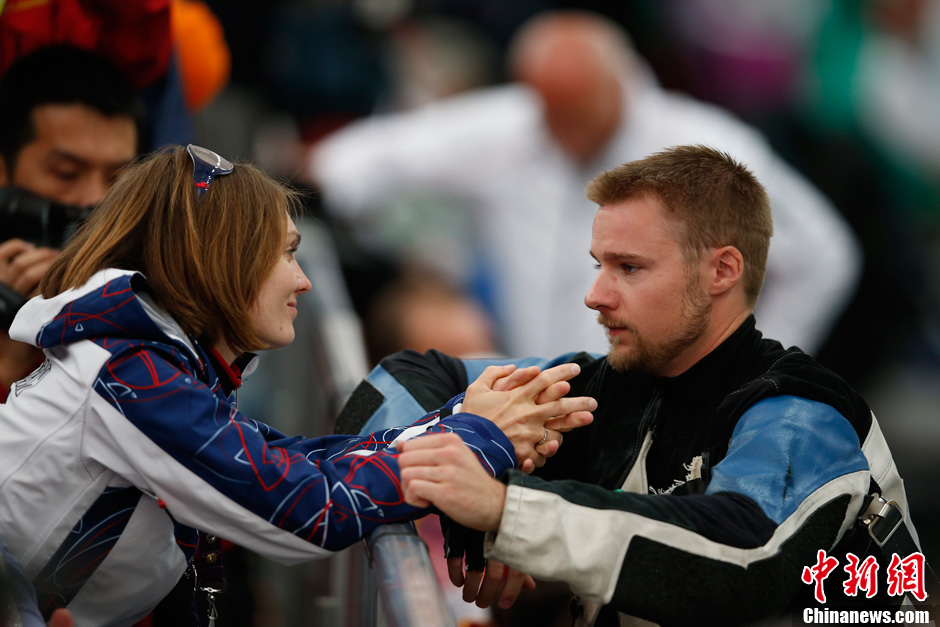 被媒体调侃为“最后一枪先生”的美国射击名将埃蒙斯,或许是奥运赛场上最悲情的选手。伦敦奥运赛场爱妻场边安慰的温馨一幕不知虐伤了多少单身狗。本届里约奥运会欲破心结的埃蒙斯重整旗鼓,当然妻子卡特琳娜已经做好了坚实后盾的准备,两人准备在里约如何秀恩爱,让我们拭目以待。图为在伦敦奥运会男子10米气步枪预选赛中,美国名枪马修·埃蒙斯未能进入决赛,场边观战的妻子安慰埃蒙斯。中新社记者 盛佳鹏 摄