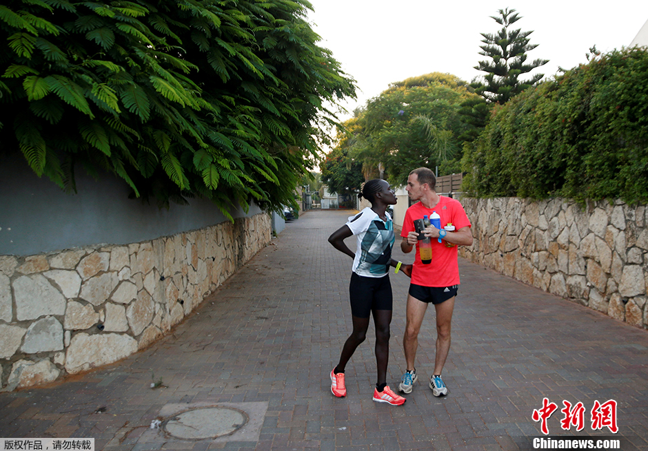 当地时间2016年7月14日,以色列长跑选手Lonah Chemtai和她的老公兼教练丹一起训练。他们即将共赴里约参加马拉松项目的比赛。有老公的陪伴,就算是这个在田径项目中耗时最长的比赛,40多公里的路上Lonah Chemtai心中也不孤单。