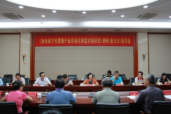座谈会上,崇左市工信委、农业局、糖业办、财政局等部门分别介绍了在糖业发展方面的基本情况、主要措施和成效以及获得的经验;中粮屯河崇左糖业公司、东亚糖业崇左公司就争取国家、自治区更多政策扶持方面提出了意见建议。与会的课题组成员就所关心的土壤环境保护、蔗区管理、甘蔗定价机制、市场化运作、互联网+糖业的发展等问题与参会各部门代表进行了深入的探讨和交流。致公党南宁市委会主委蒋晓筠在讲话时指出,蔗糖产业是我们的传统特色产业,如何通过体制机制创新保持蔗糖产业健康有序地发展,事关财政收入、农民增收、工人就业稳定的社会安定大局。她希望调研组把在区市内外调研获得的数据、资料和建议加以科学整理,认真分析,将先进地区糖业市场化转型、产业化发展的成功经验融入报告中,为加快建立糖企、蔗农、政府、金融利益共同体机制,实现农民增收、企业增效、社会稳定多赢局面提供科学、可操作的意见建议。