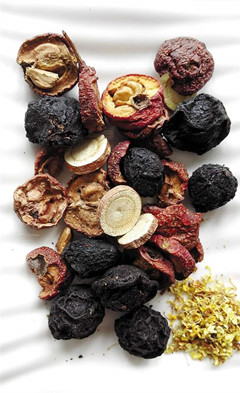 【材料】桂花10克,乌梅干30克,山楂10克,炙甘草5克,陈皮2克,冰糖适量。
