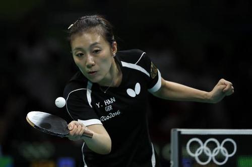 8月16日,德国队选手韩莹在比赛中。当日,在2016年里约奥运会乒乓球女子团体决赛中,德国队以0比3负于中国队,获得银牌。 新华社记者沈伯韩摄