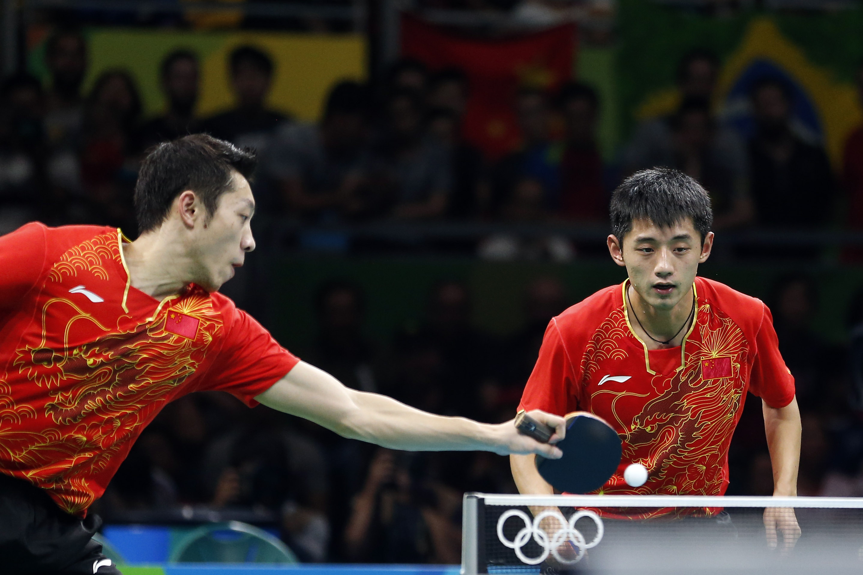中国乒乓球运动员张继科(右)/许昕击败日本队顺利夺冠。 中新社 盛佳鹏 摄