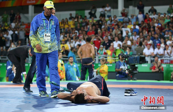 当地时间2016年8月21日,巴西里约热内卢,蒙古摔跤教练不满裁判判罚,脱得只剩内裤被逐出场。