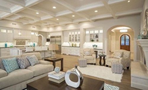这座豪宅出自设计大师亨利(Henry Mohrschladt)之手,他设计的世界级帆船和游艇曾获无数奖项。菲尔普斯与未婚妻妮可-约翰逊(Nicole Johnson)于去年搬进这座豪宅。图为豪宅客厅,开放布局,在餐厅和客厅之间配有壁炉,餐厅设有桌子和白色椅子。