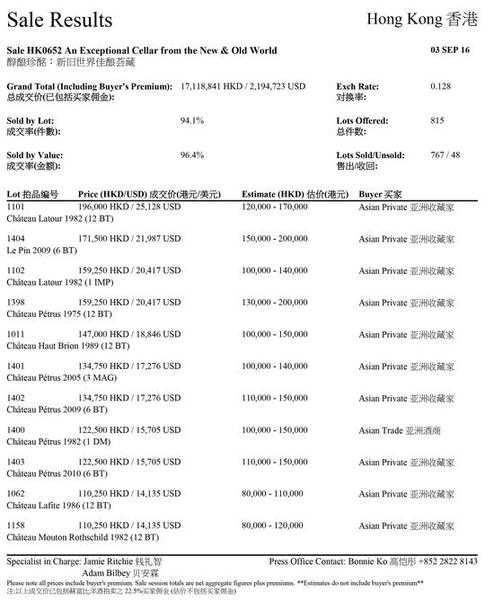 苏富比亚洲区洋酒部主管贝安霖(Adam Bilbey)表示:“我们很高兴看见亚洲藏家于拍卖现场及网上竞投一系列来自新世界与旧世界之顶级美酒。亚洲藏家对成熟的波尔多佳酿尤为追捧,再次证明资深藏家对此优质葡萄酒产地趋之若鹜。另值得一提的是,新世界佳酿亦成绩斐然,尤其是顶级酒庄如Harlan Estate及Dominus。”
