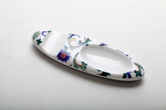 “丝路宝船”是一个汤盅,应和的是“丝路盛宴”主题,这场主题宴会上从餐具到餐桌铺陈都体现“丝绸之路”主题。餐具瓷面图案采用了牡丹元素,两束盛开的牡丹花象征丝绸之路的起源地——盛产牡丹的洛阳。而其中最著名的“丝路宝船”是用来盛汤的汤盅。该汤盅的设计灵感来源于海上丝绸之路的古船造型,盖揪设计为一艘扬帆远航的古船,盅身绘制了海上丝绸之路繁盛景象,寓意着海上丝绸之路的历史文明。盅身造型同时酷似一个巨大的元宝,象征了圆满、富裕和繁荣。此外该次宴会上的鱼盘也经过特殊的设计,当宾客吃完鱼后,盘底会盛开出一朵浅白色的牡丹。