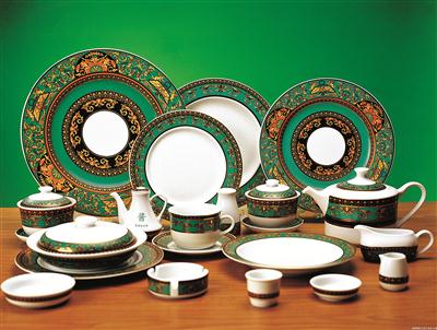 “绿金富贵”这套餐具现在已经很大众化了,大众化到什么程度呢?网上搜一搜就能买得到。这套餐瓷历史有些久远,是2001年上海举行APEC峰会时所使用的。它出自中国最负盛名的瓷都景德镇,主色调为绿色,象征了亚太地区和亚太经合组织期盼和平的美好愿望。其器形设计比较中规中矩,瓷面印花位置也很一板一眼。但细看下来却发现它其实是“简约不简单、细节见真章”。“绿金富贵”全套餐瓷均采用了标准的圆环几何形,这使得整套餐具形成了一种强烈的系统感——这种系统感更增加了餐具的庄重高贵气质。而几何圆环内的图案,则是规律重复的装饰性纹样,这种规律装饰性纹样为中规中矩的餐瓷添加了无法忽视的韵律美。不过此套餐具与其他国宴瓷有一个显著的不同,就是它的风格是偏欧式的——不管是重复韵律的装饰性纹样,还是严谨系统的几何形构图,都凸显了欧洲工艺美术运动前后的审美趣味。这样一套突破自我的国宴餐瓷出现在国际化大都市上海,的确是别有一番韵味在其中~