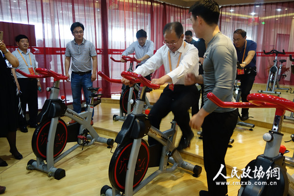 近日,山东滕州市政协组织部分常委、委员和部分枣庄驻滕委员视察体育工作开展情况,围绕全面提升体育事业发展水平,进一步满足人民群众健身需求积极建言献策。图为政协委员现场体验健身设施。陈冰 杨家渠 摄