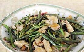 ④炒锅上火,倒入色拉油,油热入葱、姜丝煸炒几下,虾仁、蕨菜同入锅中颠炒,倒入料汁翻炒均匀即成。