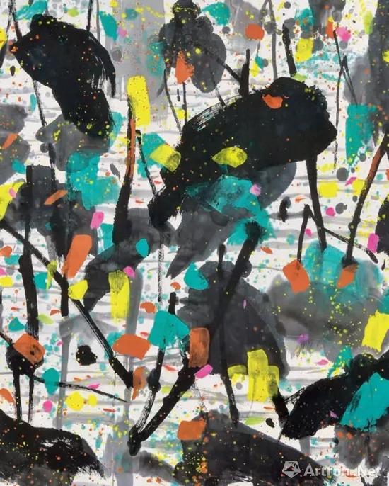 吴冠中的水墨大体上经历了四个阶段:即70年代对水墨媒介的适应期、80年代的银灰色时期、90年代前期的黑色时期和90年代后期至今的成熟整合期。1997年始,吴冠中迎来了创作生涯的巅峰,这一阶段的作品相较以往更强调对作品意境的表达,在很大程度上改变了他以往过于强调唯美的做法。吴冠中曾说:“抽象美是形式美的核心。”此幅《荷塘》就是这一成熟时期的代表性作品,整体略偏抽象,尺幅恢宏,显示了近耄耋之年的吴冠中挑战自我的决心。