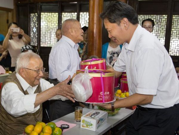 随后,与会会员欢聚一堂,共同为12位80岁以上的老会员举行集体祝寿活动,赵跃进主委和孙尚权部长为他们一一送上蛋糕和健康祝福。区委会副主委孙鑫柔代表区委会在祝寿会上致辞,区委会主委辛涌代表区委会通报了会务情况。张哲能、郑向东等老寿星在座谈会上作了即兴发言。台州市委会主委赵跃进代表市委会向各位老同志致以节日的祝愿和问候,对老会员为会的事业作出的无私奉献表示感谢,对民建组织举办的重阳节敬老系列活动表示肯定,他要求椒江民建要继承敬老爱老的优良传统,时刻不忘老会员创业功绩,努力开创椒江民建各项工作的新局面。