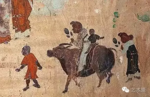 有信仰的中国古人,家庭团聚时会选择集体顶礼膜拜。在莫高窟第323窟南壁的佛教史迹画中,保留有一家老少四口前往江边瞻礼佛像的有趣画面,这其实也是一幅家庭出游图。画面中奶奶和孙子一起坐在水牛背上,奶奶和主妇手持花朵预备供佛,饶有趣味。