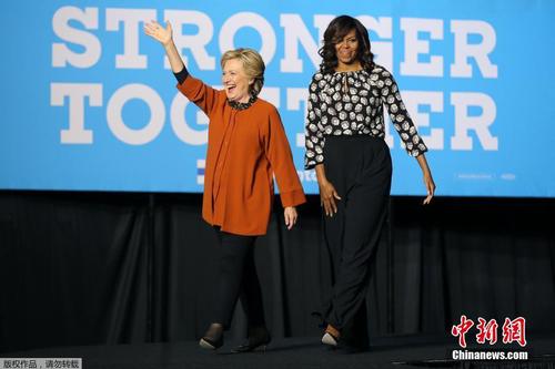 当地时间2016年10月27日,美国北卡罗莱纳州温斯顿萨勒姆,美国民主党候选人希拉里举行竞选集会,美第一夫人米歇尔助阵。