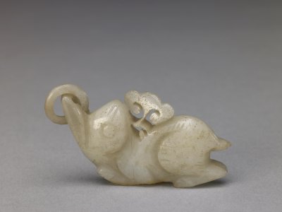 佩白玉质,玉料表面略有麻坑点,圆雕一兔,圆眼,回首,口衔灵芝,灵芝镂雕。兔耳相交,中套一圆环,可悬挂。玉兔前腿前伏,身上毛纹竖立,回首之态显得十分机敏。此器雕琢简洁明快,抓住了白兔回首的那一刹那神态,惟妙惟肖,极具动感。