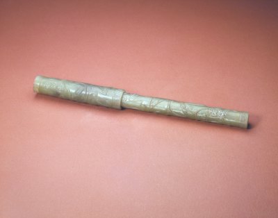 玉螭纹笔,明,通长23.7cm,管径1.6cm,帽径2cm。清宫旧藏。