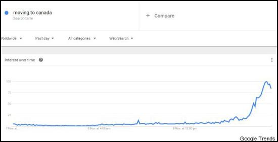 与此同时,据廉价飞行网(CheapFlight.com)消息,单程飞往加拿大的搜索量激增。谷歌上,“前往加拿大”的搜索量,以及关键词“移民”的搜索量同样直线上升。