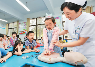 5月13日,湖北省襄阳市医护志愿者为小学生上急救知识课。(人民视觉)