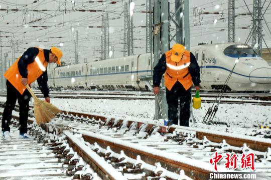 为确保陇海线客运安全畅通西安西站全力进行铁轨防冻除雪工作。 钟翰林 摄
