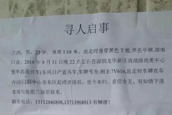 记者了解到,目前,深圳警方与中山警方均在全力寻找兰剑。家属也通过发寻人启事等方式正在寻人,希望社会热心人士能帮一帮,有知情下落者可通过上述方式联系。