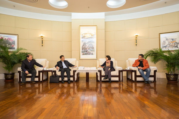 人民政协报社副总编辑张宝川(左一),人民政协报社副社长、人民政协网执行董事王相伟(右一),与柯杨委员和曹洪欣委员交流。
