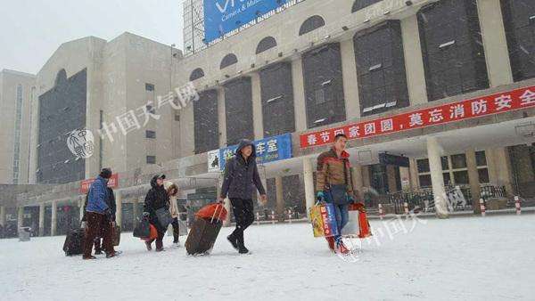 1月26日,黑龙江哈尔滨火车站返乡旅客冒雪赶火车。(摄影/吕国君)