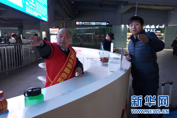 2月11日,在杭州公交集团三公司担任公交司机的全国道德模范、全国劳动模范孔胜东(左)在杭州东站东广场做志愿服务。新华社记者 张璇 摄