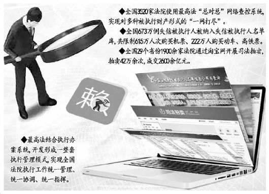 据了解,2014年年底,最高法正式开通“总对总”网络查控系统,现在已经实现对多种财产形式的“一网打尽”。最高法与3400多家银行以及公安部、交通部、工商总局、人民银行等单位实现联网,可以查询到被执行人全国范围内的存款、车辆、证券、网络资金等14类16项信息。全国所有3520家法院都能使用该系统进行查控。