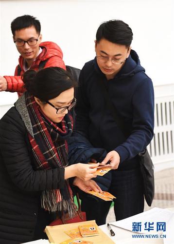 3月1日,在北京人民大会堂澳门厅,参加十二届全国人大五次会议采访报道的记者领取证件。 新华社记者赵颖全摄