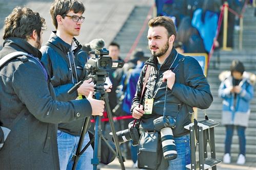 3月3日,全国政协十二届五次会议在北京人民大会堂开幕,参与报道中国两会的外国媒体记者准备进入会场采访。 本报记者 高兴贵摄