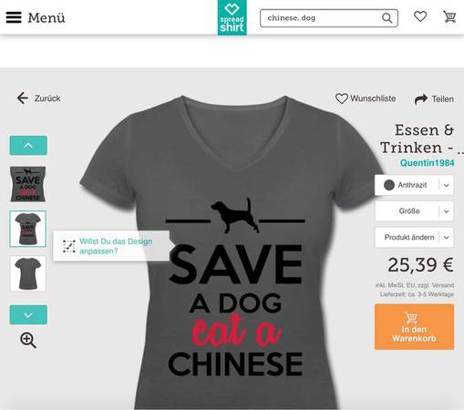一名用户留言质问:“救一只狗就要吃一个中国人?你需要开些新玩笑,并好好审一审上网的内容,别让你们的生意全成为狗屎!”还有陈姓用户说:“救一条鲨鱼,吃一个中国人?从什么时候开始,为了保护动物就对我们华人种族歧视了?”该网站并没有对这些质疑作回应,但已从周二开始删除这两款T恤的零售信息。《赫芬顿邮报》认为,该网站还是有些产品有歧视亚洲人的嫌疑,如有的印有日本妇女形象,并写有“亚洲妓女”的字眼。