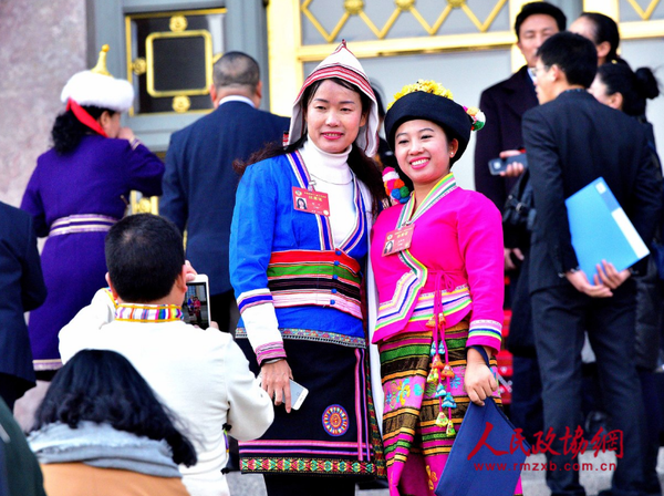 人民政协网北京3月4日电 在备受关注的全国两会上,来自全国各地的少数民族委员们,身着独具特色的民族服装,成为一道亮丽风景线。人民政协网记者 田福良 摄