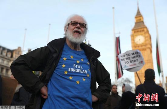 资料图:当地时间2017年3月13日,英国伦敦,民众在国会大厦前聚集示威,抗议“脱欧”。